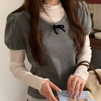 여성 봄 데일리 벨벳 퍼프 반팔 티셔츠