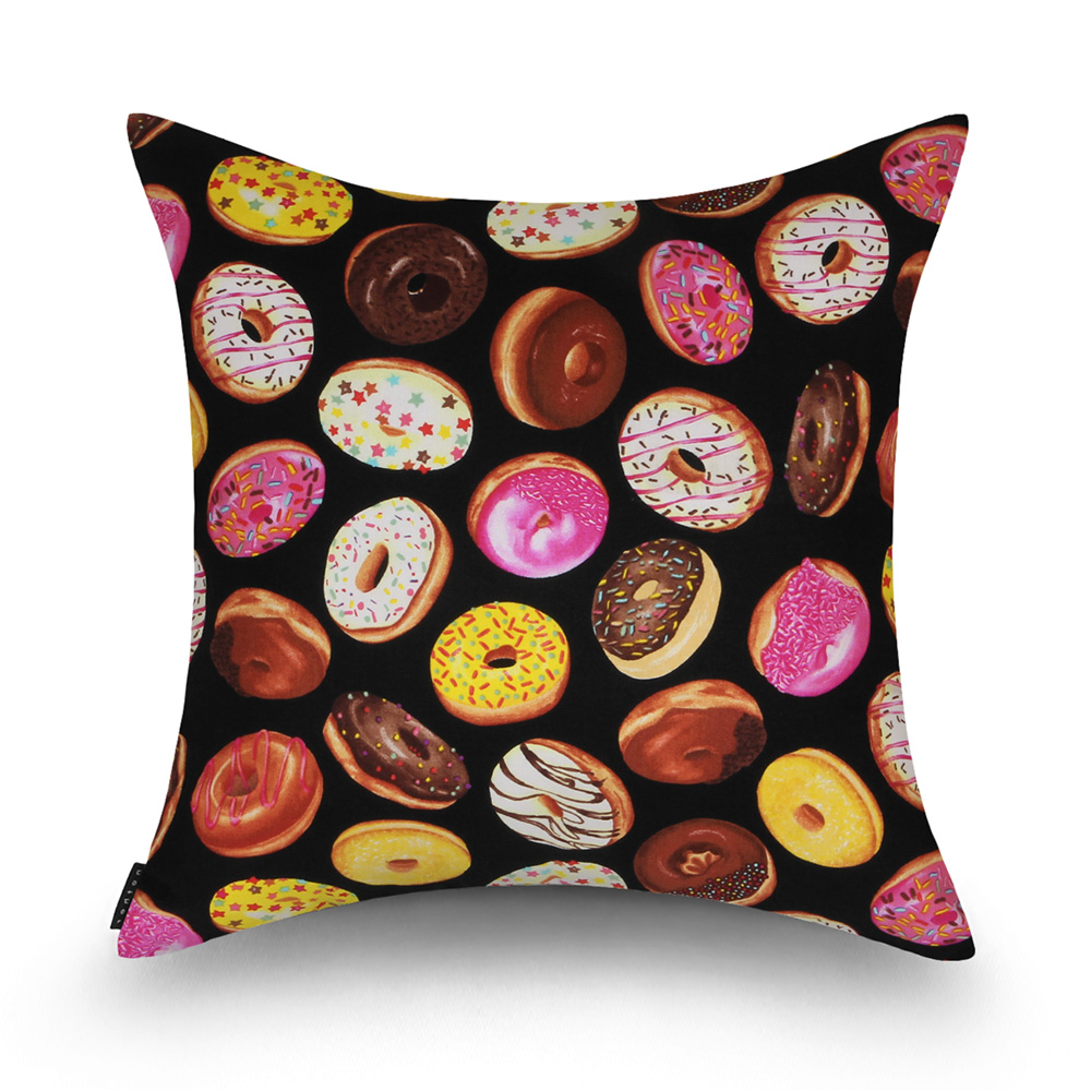 블랙 컬러 배경위에 다양한 토핑과 플레이버의 컬러풀 도넛을 표현한 유니크 감성의 쿠션 입니다.