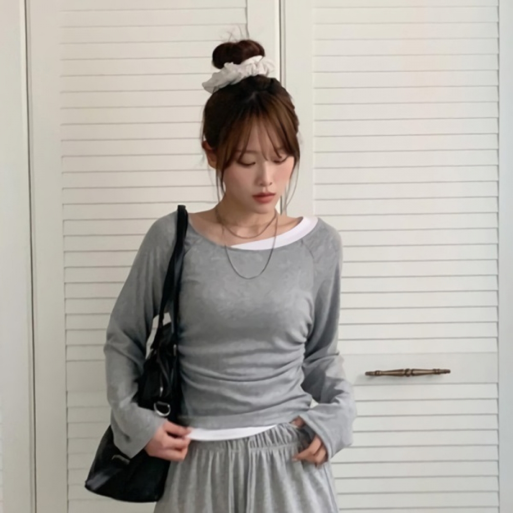 여성 언발 배색 레이어드 옆셔링 슬림 티셔츠