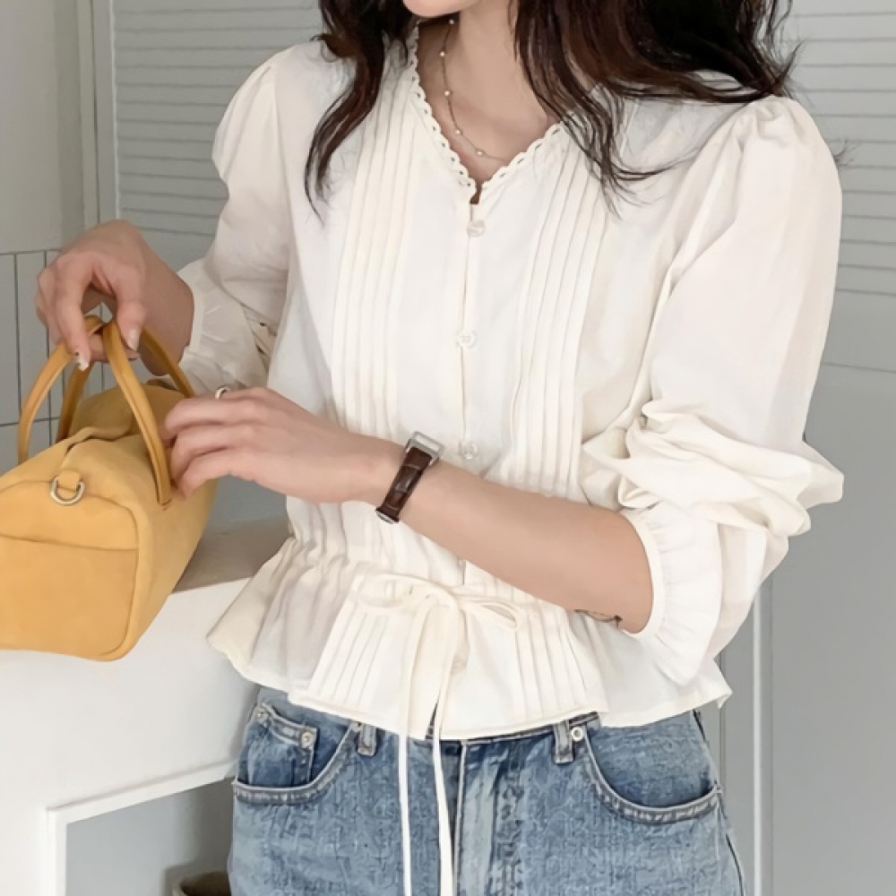 여성 코튼 러플 브이넥 리본 퍼프 블라우스