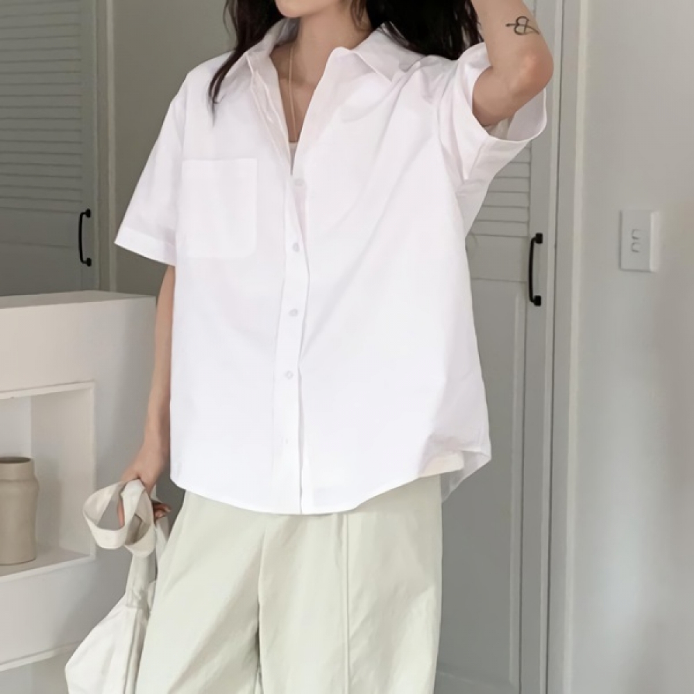 여성 봄 여름 옥스포드 포켓 반팔 셔츠
