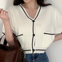 여성 봄 브이넥 포켓 배색 반팔 가디건