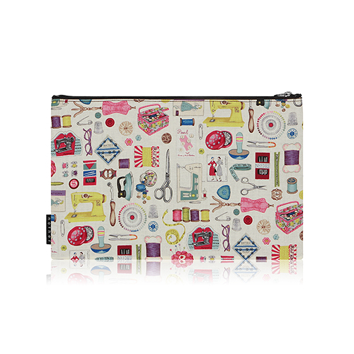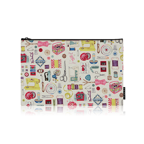 레트로 감성의 봉재 용품들을 패턴화한 코튼 소재 파우치 입니다.