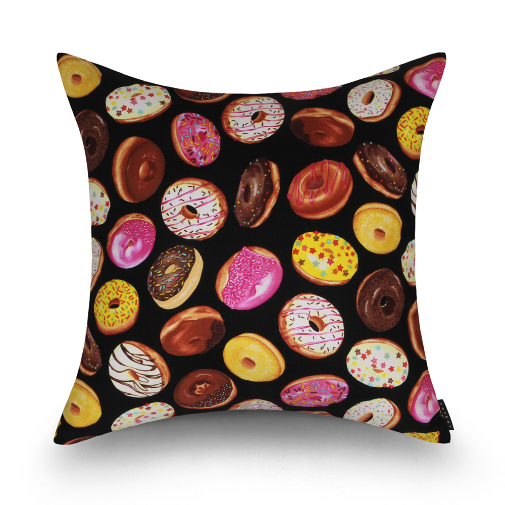 블랙 컬러 배경위에 다양한 토핑과 플레이버의 컬러풀 도넛을 표현한 유니크 감성의 쿠션 입니다.