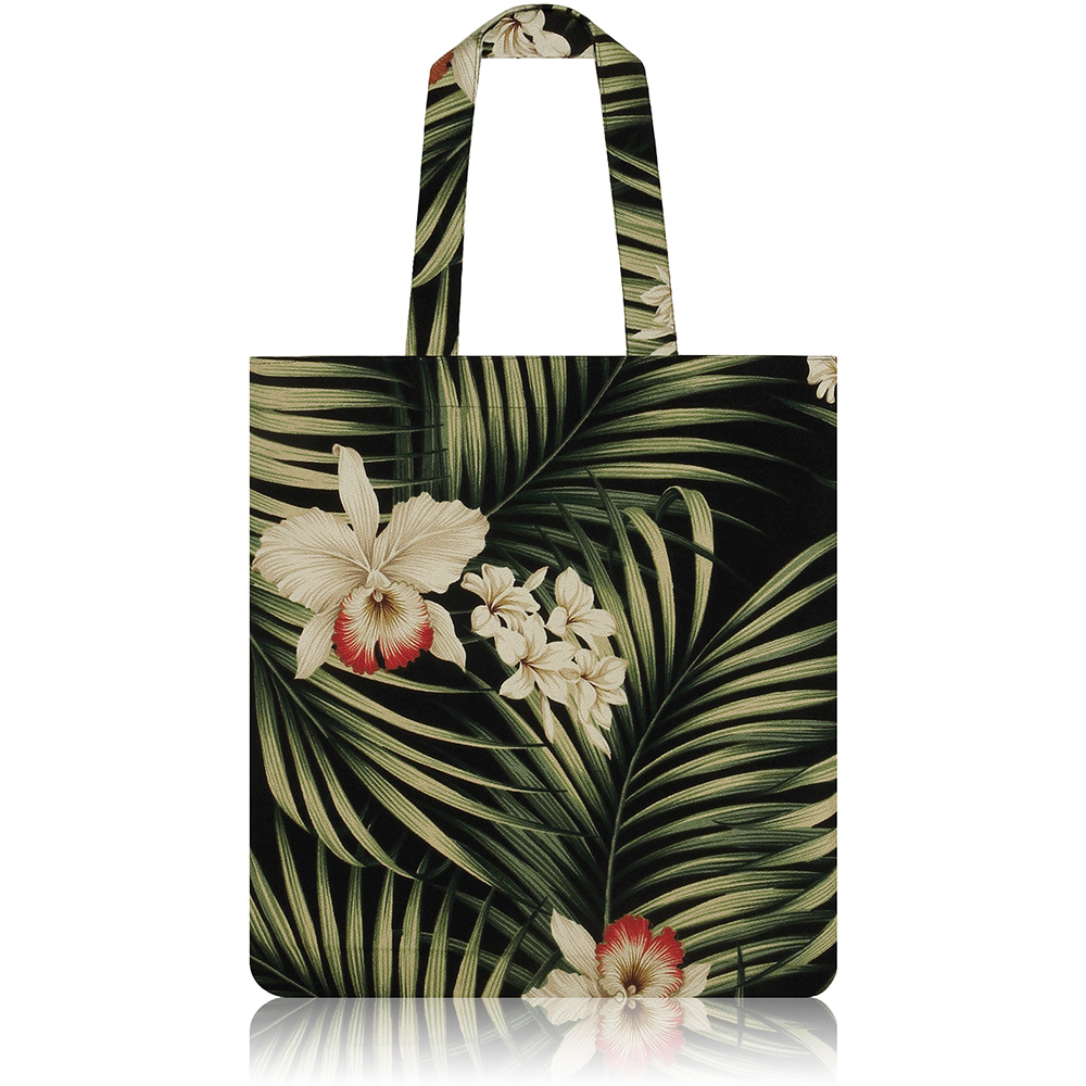 A stunning bag of Hawaiian-inspired tropical print, featuring hawaiian orchid, plumeria and other tropical leaves. Twin grab handles & Inner pocket.