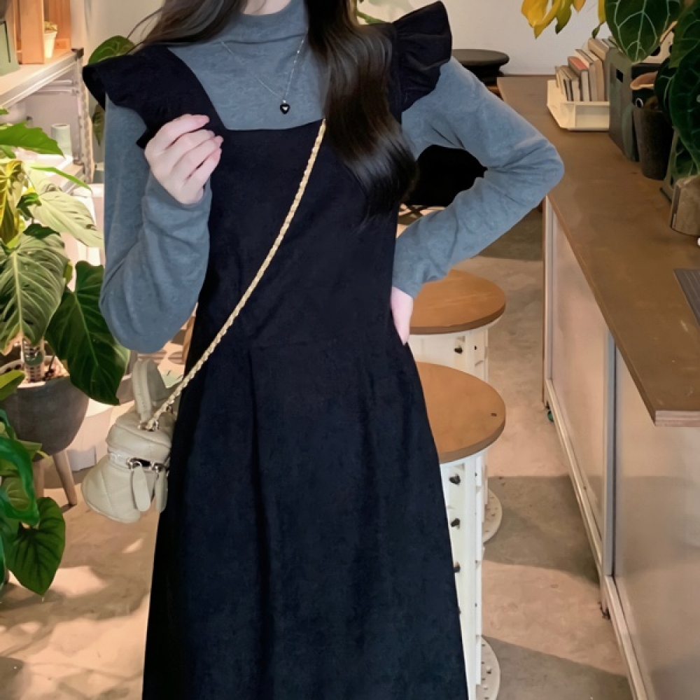 그레이 목폴라 프릴 서스펜더 롱원피스 세트