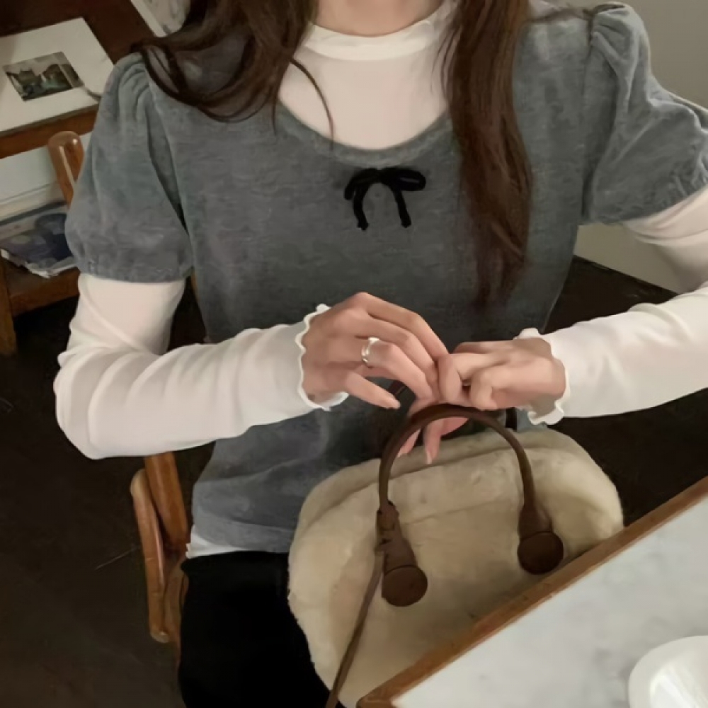 여성 봄 데일리 리본 퍼프 반팔 티셔츠
