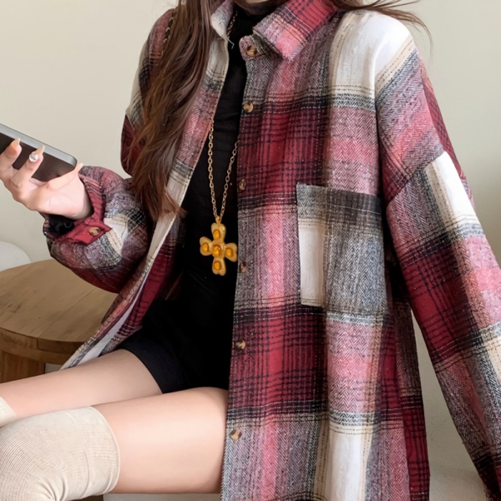 여성 오버핏 레이어드 레드 체크 셔츠 자켓