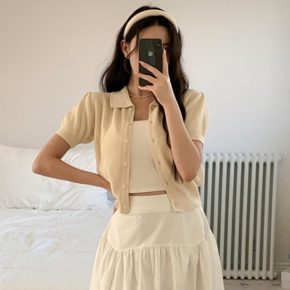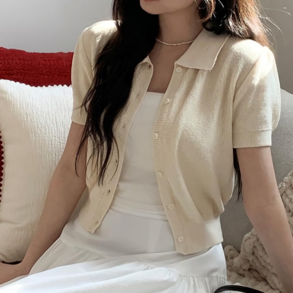 여성 봄 데일리 퍼프 소매 카라 니트 가디건