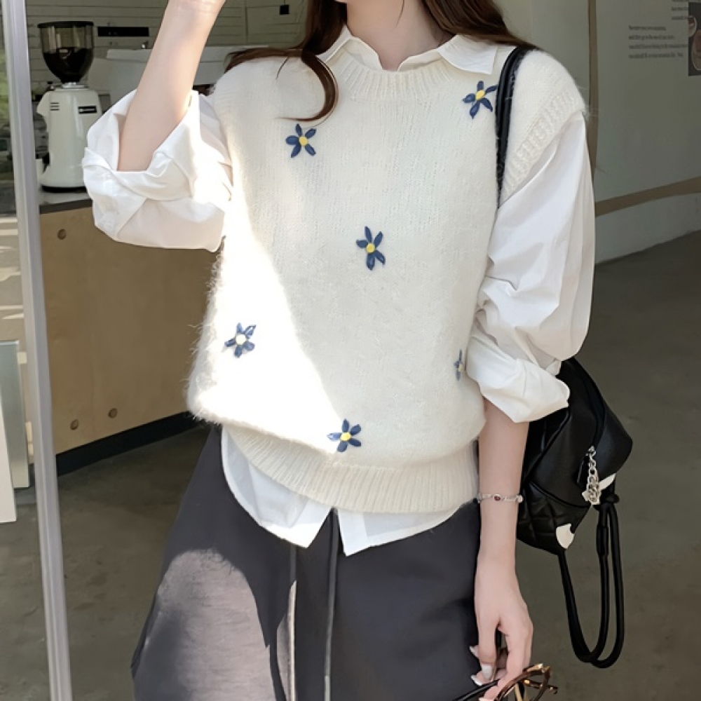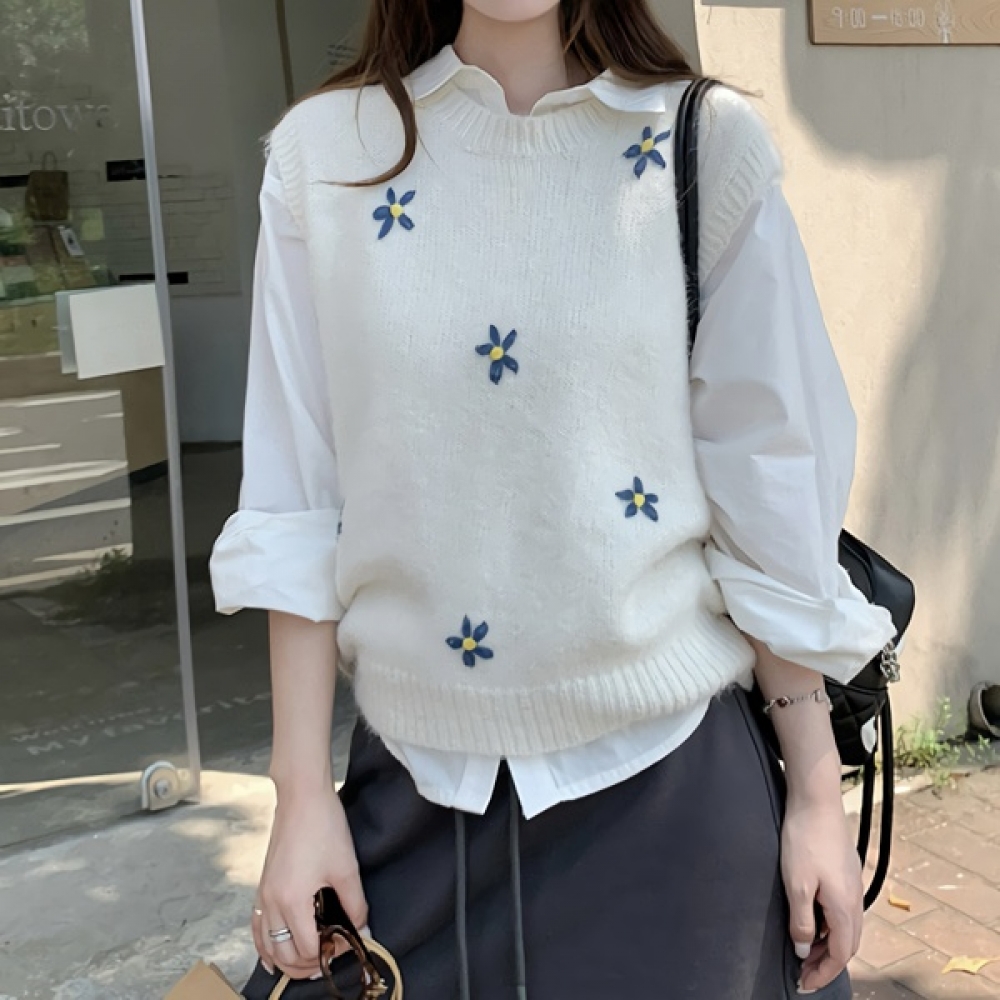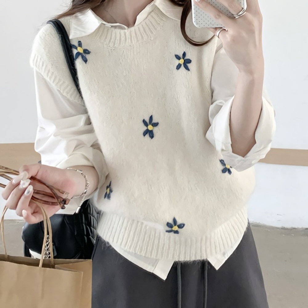 여성 봄 플라워 자수 니트 베스트