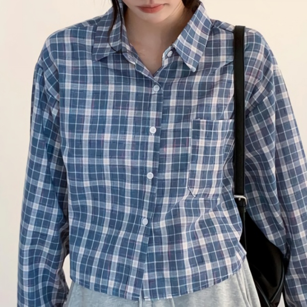 여성 포켓 루즈핏 세미크롭 체크 남방